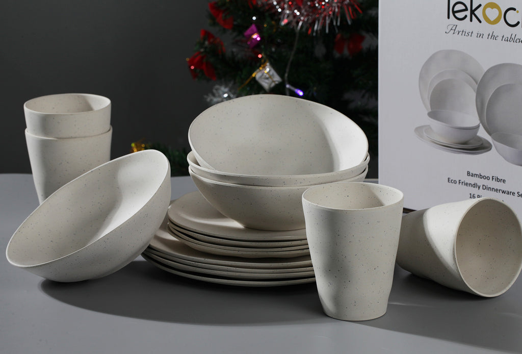 LEKOCH Ensemble de vaisselle en bambou blanc série Wave 8 pièces ensemble d'assiettes biodégradables et écologiques